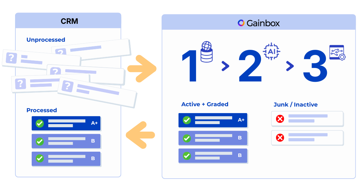 When your CRM is connected to Gainbox, accounts are continuously validated and graded as they are added or updated. Grades and other relevant data in Gainbox are pushed back to your CRM on a schedule.