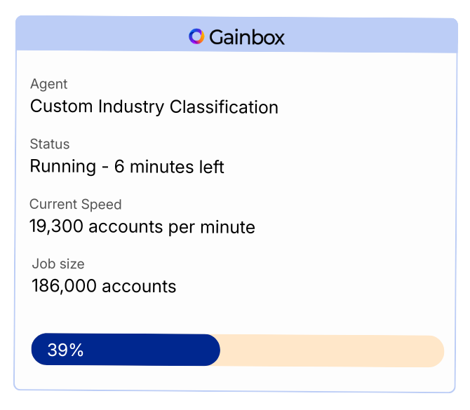 Gainbox’s infrastructure allows you to automate manual research at massive scale. More than 1000 concurrent AI agents let you enrich data using custom prompts at a rate of over 10,000 accounts per minute.